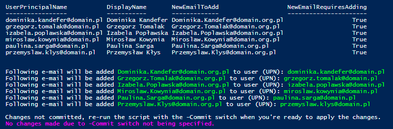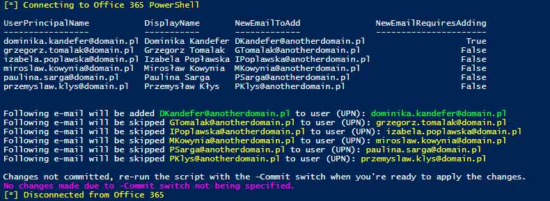 Commit – $true/$false (default $false) – is required to add new emails to existing users