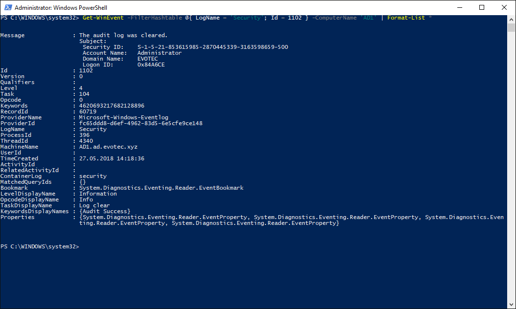 Get-WinEvent -FilterHashtable @{ LogName = 'Security'; Id = 1102 } -ComputerName 'AD1' | Format-List *