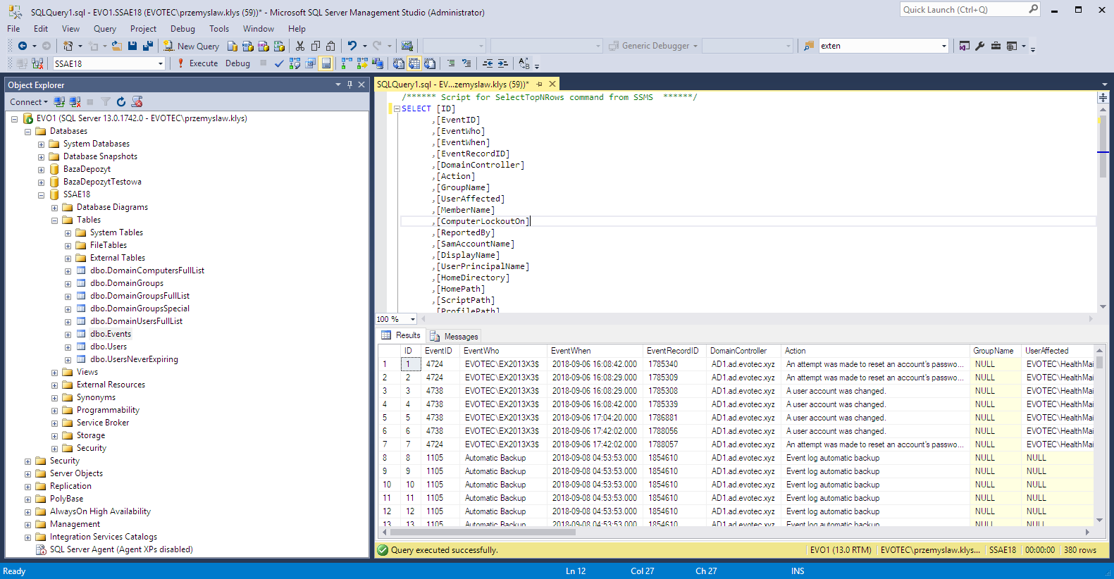 SqlCheckBeforeInsert = 'EventRecordID', 'DomainController' # Based on column nameg